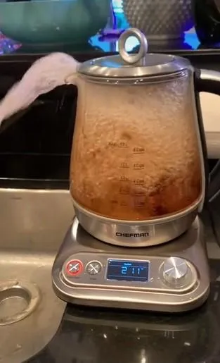 Все було б нормально, але глядачів здивував один нюанс. Жінка поклала розсипний чай у спеціальний фільтр, який розташований всередині чайника. Після кип’ятіння вода просто почала виливатися назовні.
