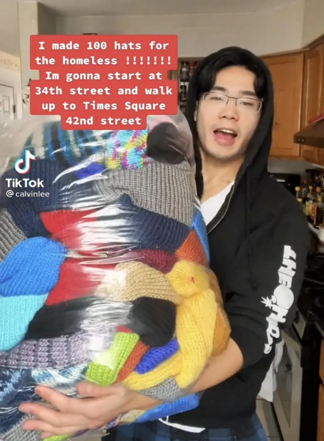 Проте останні публікації викликали неабиякий резонанс. 24-річний юнак почав в'язати теплі ковдри та шапки для безхатьків. Ще на початку року він поставив собі за мету створити 100 елементів одягу та роздати його бездомним. Так Келвін довів на своєму прикладі, що хобі може стати чудовим способом допомогти тим, хто цього потребує.