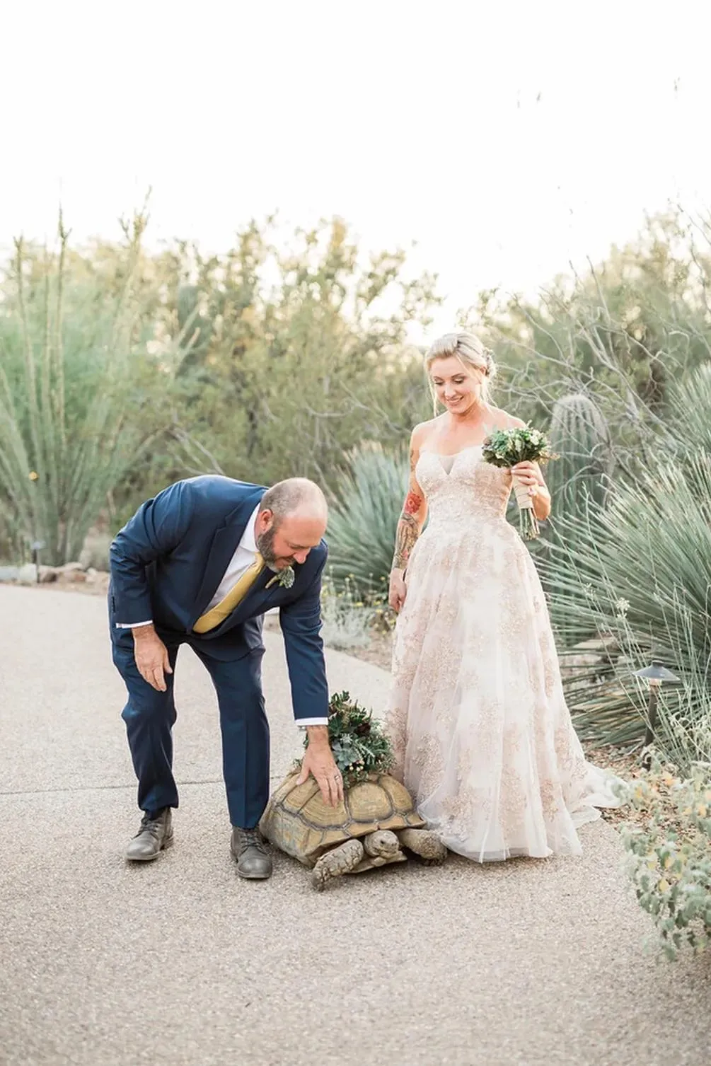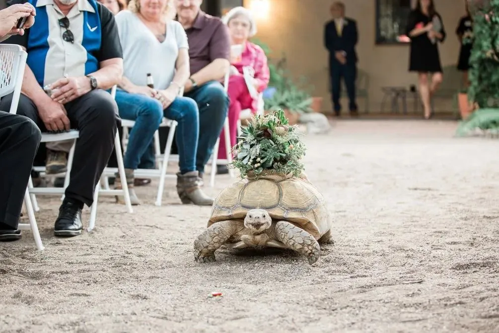 Вони доручили тварині важливу місію – винести обручки під час церемонії. Наречена розповіла, що це був найтриваліший шлях, адже Тому знадобилось аж дві пісні, щоб принести весільні атрибути. Аби черепаха не збивалась з дороги і дісталась до місця призначення, для неї завчасно підготували доріжку та всипали її полуницею.