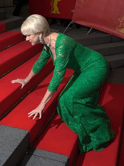 Не втримала рівновагу і Гелен Міррен, яка не змогла подолати сходинки в розкішній зеленій сукні.